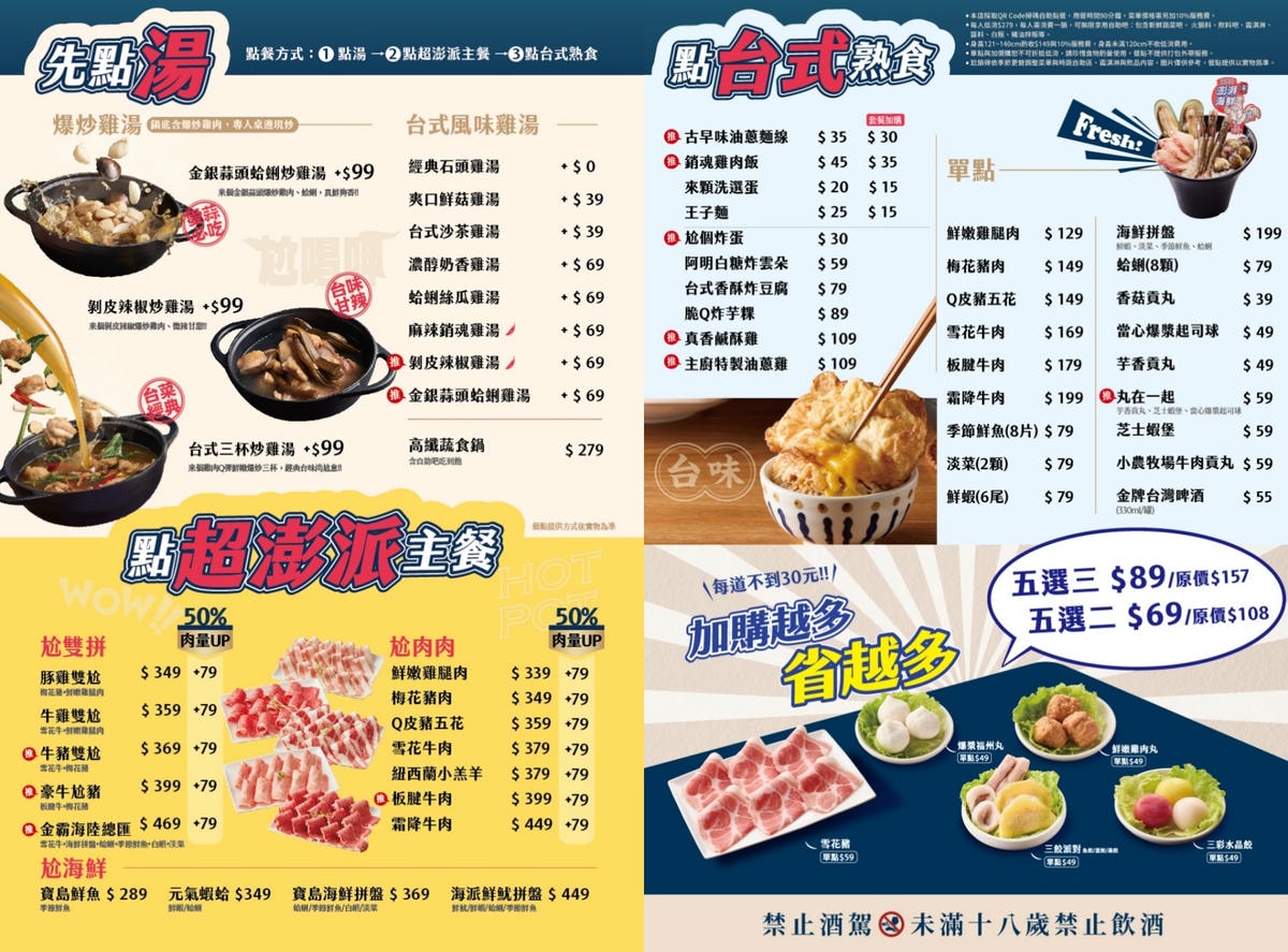 尬鍋台式潮鍋 由人員帶位入座後自行掃描桌上 QR Code 點餐,餐畢再帶著帳夾到門口櫃檯結帳;餐點選擇方式為 先點湯 > 點主餐(肉品) > 額外加購熟食或食材單點。用餐時間90分鐘,每人低消$279,每人需消費一鍋即可無限暢享自助吧 (含新鮮蔬菜、火鍋料、飲料、醬料、白飯、豬油拌飯及霜淇淋),菜單價格需另加10%服務費;身高121-140公分酌收$149及10%服務費,身高未滿120公分不收低消費用。